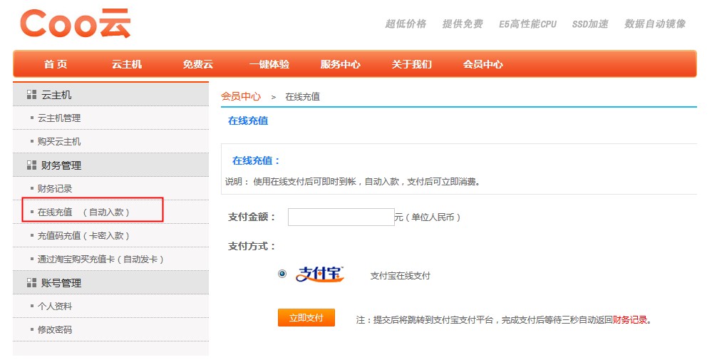 2、登陸成功后點擊 在線充值(自動入款),輸入充值金額,點擊立即充值,完成支付,回到會員中心。
