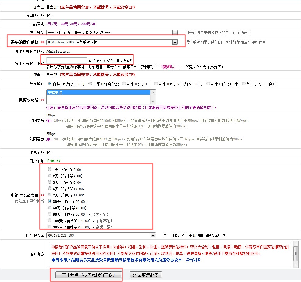 4、選擇需要的操作系統,設置登陸操作系統的密碼,并選擇開通的時長,點擊立即開通。(系統將自動安裝,等待5-10分鐘就可以進行連接使用云主機了)