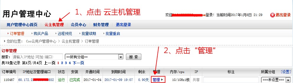 1、首先登陸會(huì)員中心,點(diǎn)擊云主機(jī)管理>管理,如下圖
